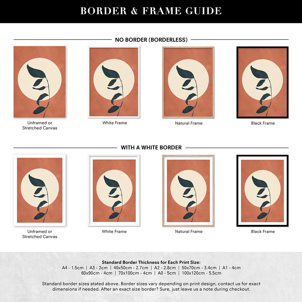 Prints are shown in a frame. If you would like your prints framed, please select a framed option shown. All sizes listed are edge to edge print sizes. If you are purchasing a framed print, please note the final measurement inclusive of the frame will be approx. 4 cm more in height + width than the print size listed. eg- 40 x 50 cm print becomes approx. 44 x 54 cm when framed. Please see our sizing page for help choosing the right size.