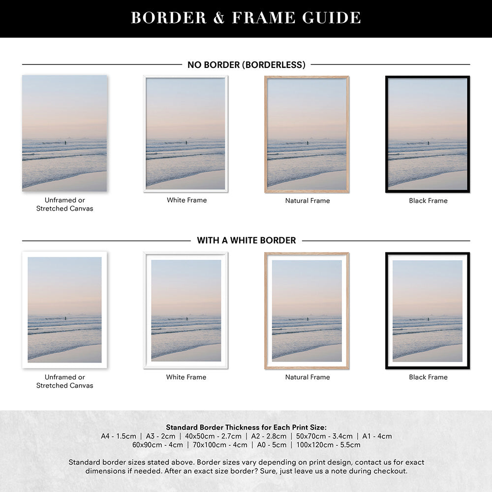 Prints are shown in a frame. If you would like your prints framed, please select a framed option shown. All sizes listed are edge to edge print sizes. If you are purchasing a framed print, please note the final measurement inclusive of the frame will be approx. 4 cm more in height + width than the print size listed. eg- 40 x 50 cm print becomes approx. 44 x 54 cm when framed. Please see our sizing page for help choosing the right size.