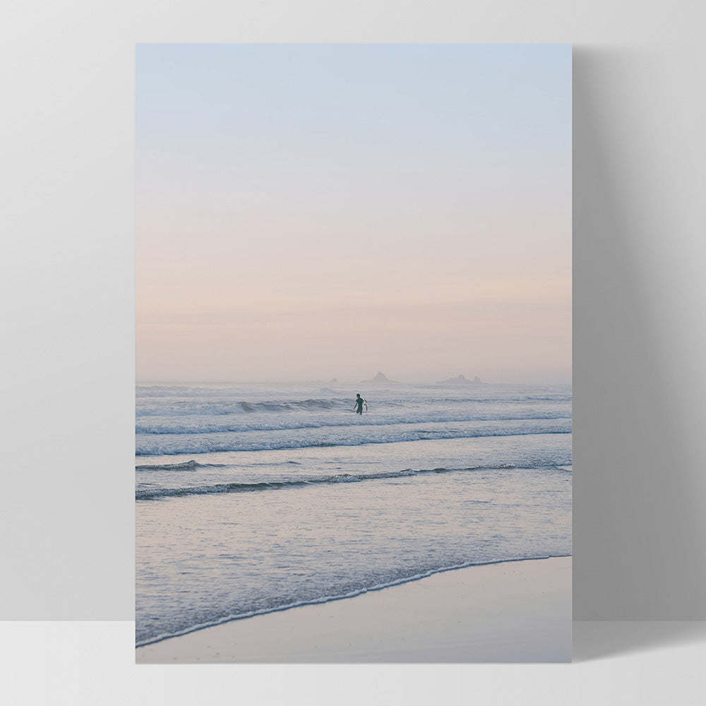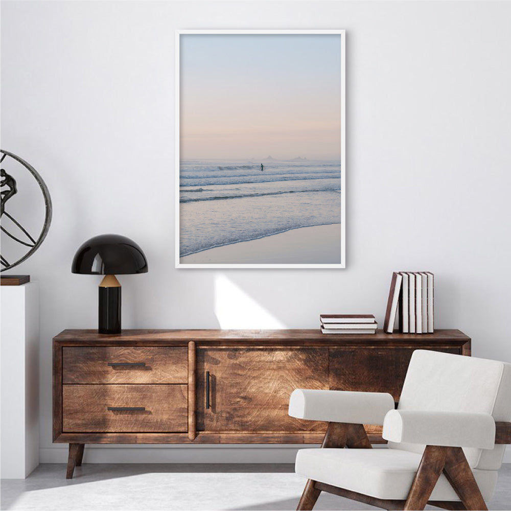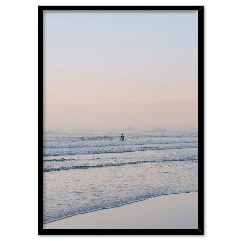 Surfer at Dawn - Art Print, Poster, Stretched Canvas or Framed Wall Art, Showing White , Black, Natural Frame Colours, No Frame (Unframed) or Stretched Canvas, and With or Without White Borders