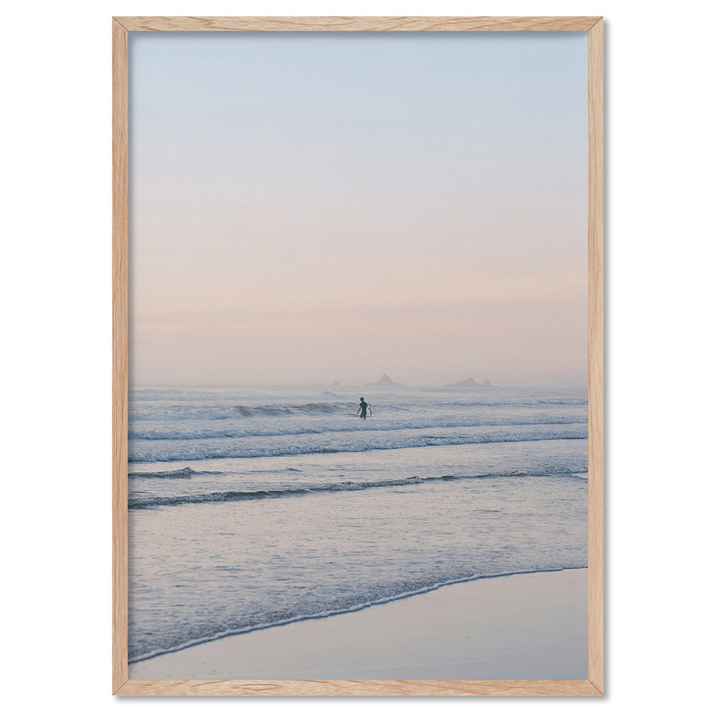 Surfer at Dawn - Art Print, Poster, Stretched Canvas, or Framed Wall Art Print, shown in a natural timber frame