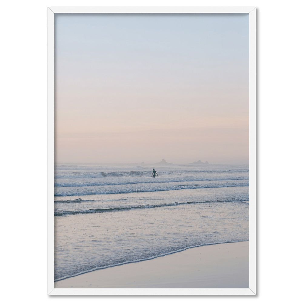 Surfer at Dawn - Art Print, Poster, Stretched Canvas, or Framed Wall Art Print, shown in a white frame